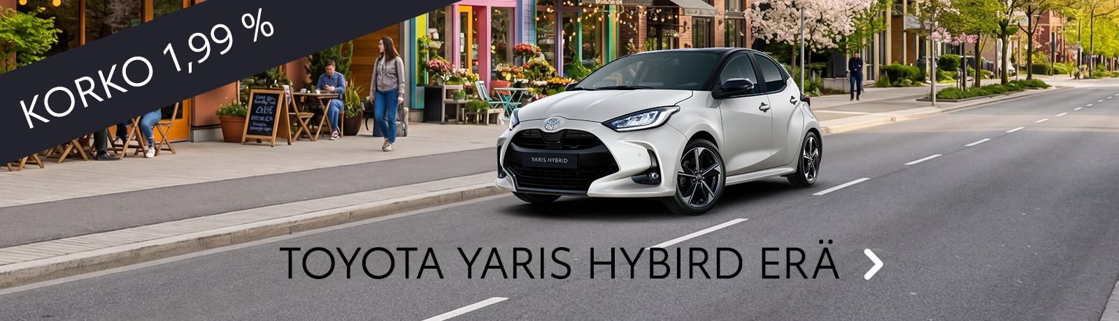 Esimerkki: Toyota Yaris 1,5 Hybrid 116 Classic Edition 270 €/kk sis. käsittelykulu 15 €/kk. Korko 1,99 %, luoton avausmaksu 399 €, käsiraha 0 €, osamaksu/auton hinta 24996,91 €, luottoaika 60 kk, viimeinen suurempi erä 12246,93 €, luotto+luottokustannukset yht 28177,31 €, todellinen vuosikorko 3,44 %. Vaatii hyväksytyn luottopäätöksen.